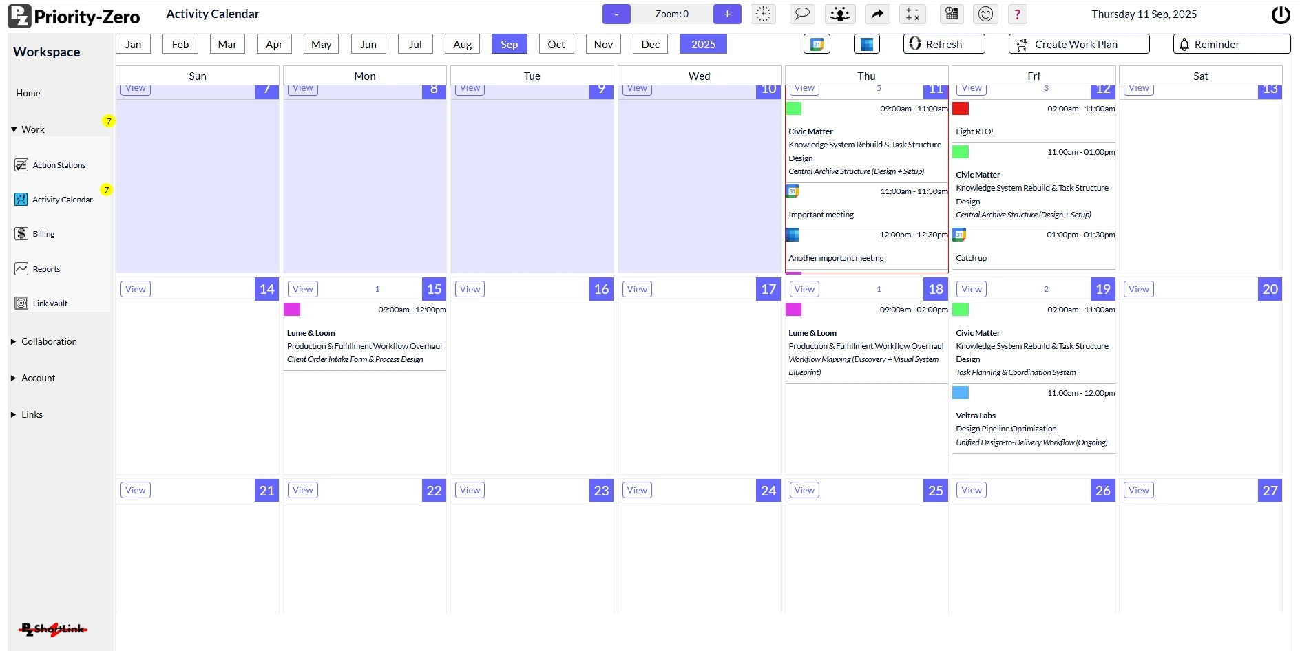 Calendars, meetings, timelines, files, notes, reports, and billing are all brought together in one place with Priority-Zero. The platform removes the need to juggle multiple tools, prevents double-bookings, and gives both clarity and control. Clients can schedule sessions only in available times, while all work blocks and appointments are managed in a single space.