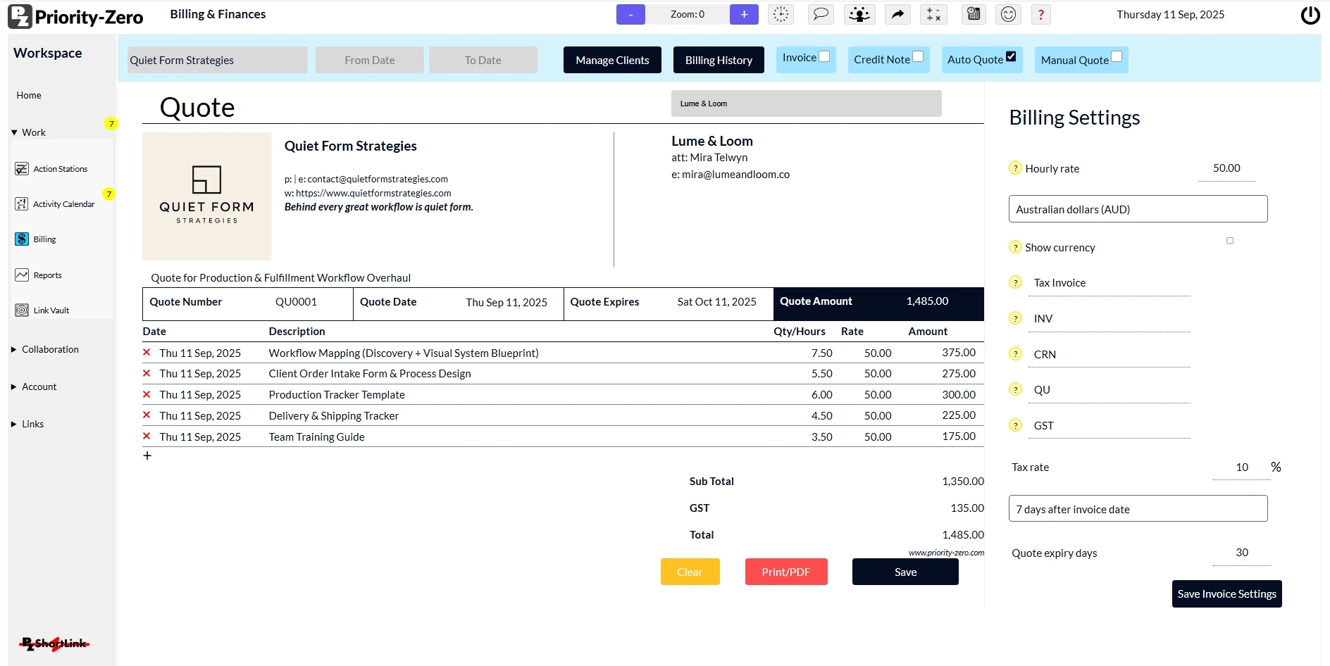 Auto-generate quotes from unquoted work. Create invoices in seconds. Bill by time or task.